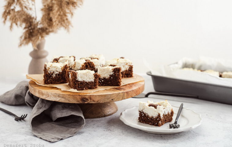 A kakaós masszát sütőpapírral bélelt kb. 20 x 30 cm-es tepsibe öntjük. A tetejére kanalazzuk foltokban a túrós masszát, és 180 fokra előmelegített sütőben 25 perc alatt készre sütjük. (Tűpróba!)