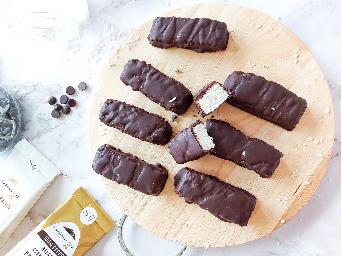Kezdjük el vízgőz felett felolvasztani a pasztillákat, ha szeretnénk édesíthetjük a csokoládét is por állagú édesítővel. Ha szépen megolvadt a csoki vegyük le a tűzről és a hűtőből kivett kókusz szeleteket kezdjük el belemártogatni. Egyesével fürdessük meg az olvadt csokiban, majd helyezzük vissza őket a sütőpapírra. Ha végeztünk tegyük vissza hűtőbe 5 percre. Ha letelt az idő, végül csurgassunk rájuk még a maradék olvadt csokiból, így elnyeri a Bounty formáját a csoki.