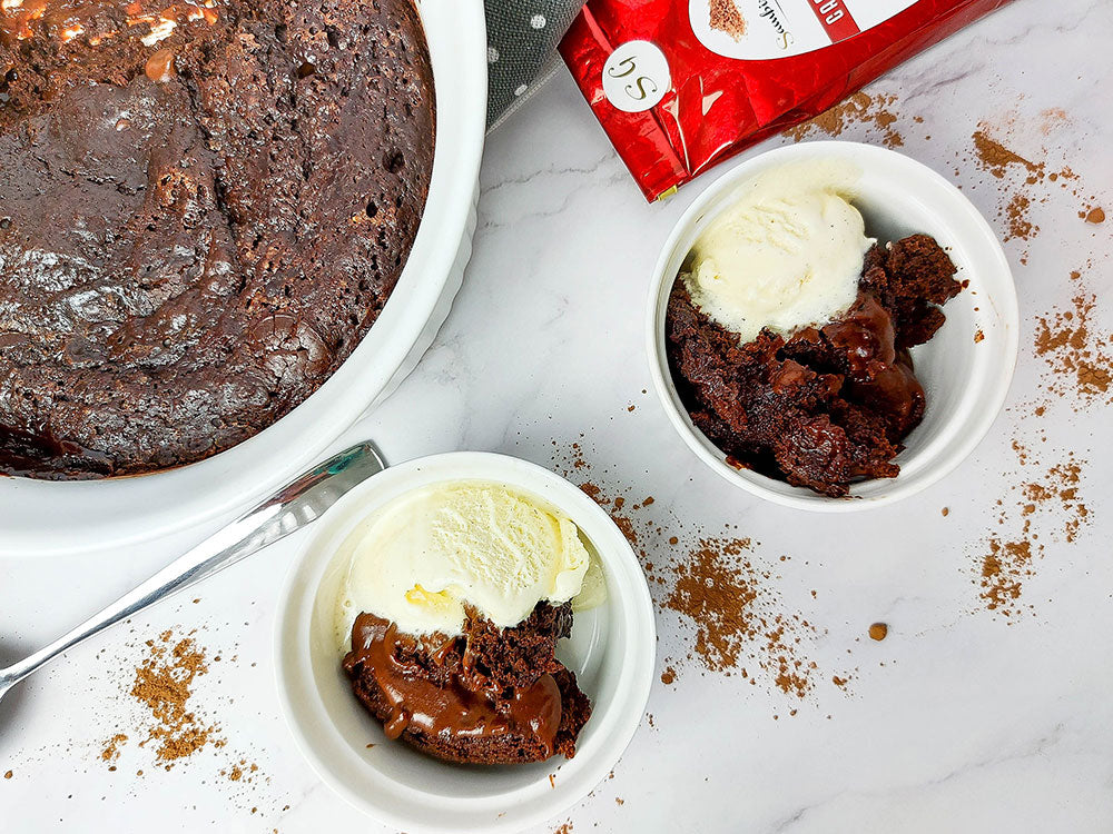 Vegyünk elő egy kerámia torta sütő formát, majd keverjük el benne a száraz összetevőket, a lisztet, cukrot, kakaóport és a sütőport. Következő lépésben, adjuk hozzá a tejet, olajat és a vaníliát. Jól dolgozzuk össze az összetevőket. Ha megvagyunk egy tálba keverjük el a felső rétegre szánt száraz összetevőket, majd szórjuk rá a tészta tetejére. Vigyázzunk, ebben a lépésben már nem kell összekeverni a felső réteget a tésztával. Ha ezzel is megvagyunk öntsük le a 310ml nagyon forró vízzel és mehet be a sütőbe. A sütési idő lejártával hagyjuk a tésztát 15 percet pihenni mielőtt szervíroznánk. Adagoljuk kis tálakba még melegen egy gombóc vanília fagyival.