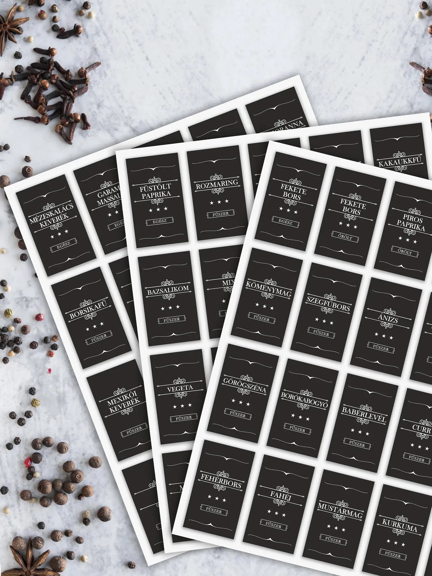 A csomag tartalma 60 db öntapadós, víz és olaj álló fűszer matrica.