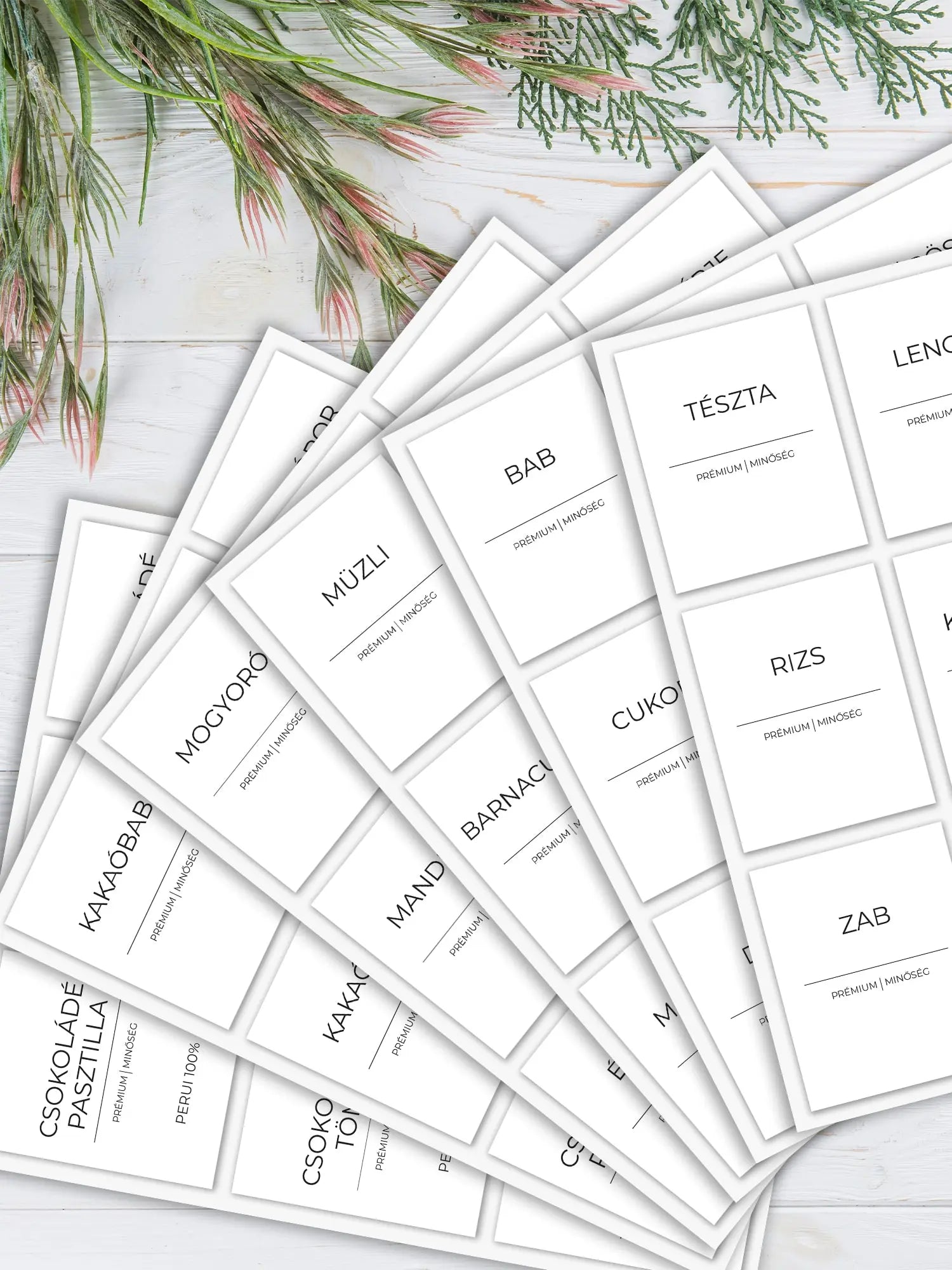 Élelmiszer matricák: Aszalt gyümölcs, Bab, Balzsam ecet, Barnacukor, Bulgur, Csicseriborsó Cukor, Dara, Dió, Ecet, Étolaj, Fehérje, Granola, Hajdina, Keksz, Kesudió, Kuszkusz, Kávé, Kókusz, Kókuszolaj, Köles, Lencse, Lenmag, Liszt, Mandula, Mazsola, Mogyoró, Morzsa, Méz, Müzli, Olivaolaj, Pisztácia, Quinoa, Rizs, Superfood, Szezámmag, Sárgaborsó, Só, Tea, Tészta, Vörös lencse, Zab