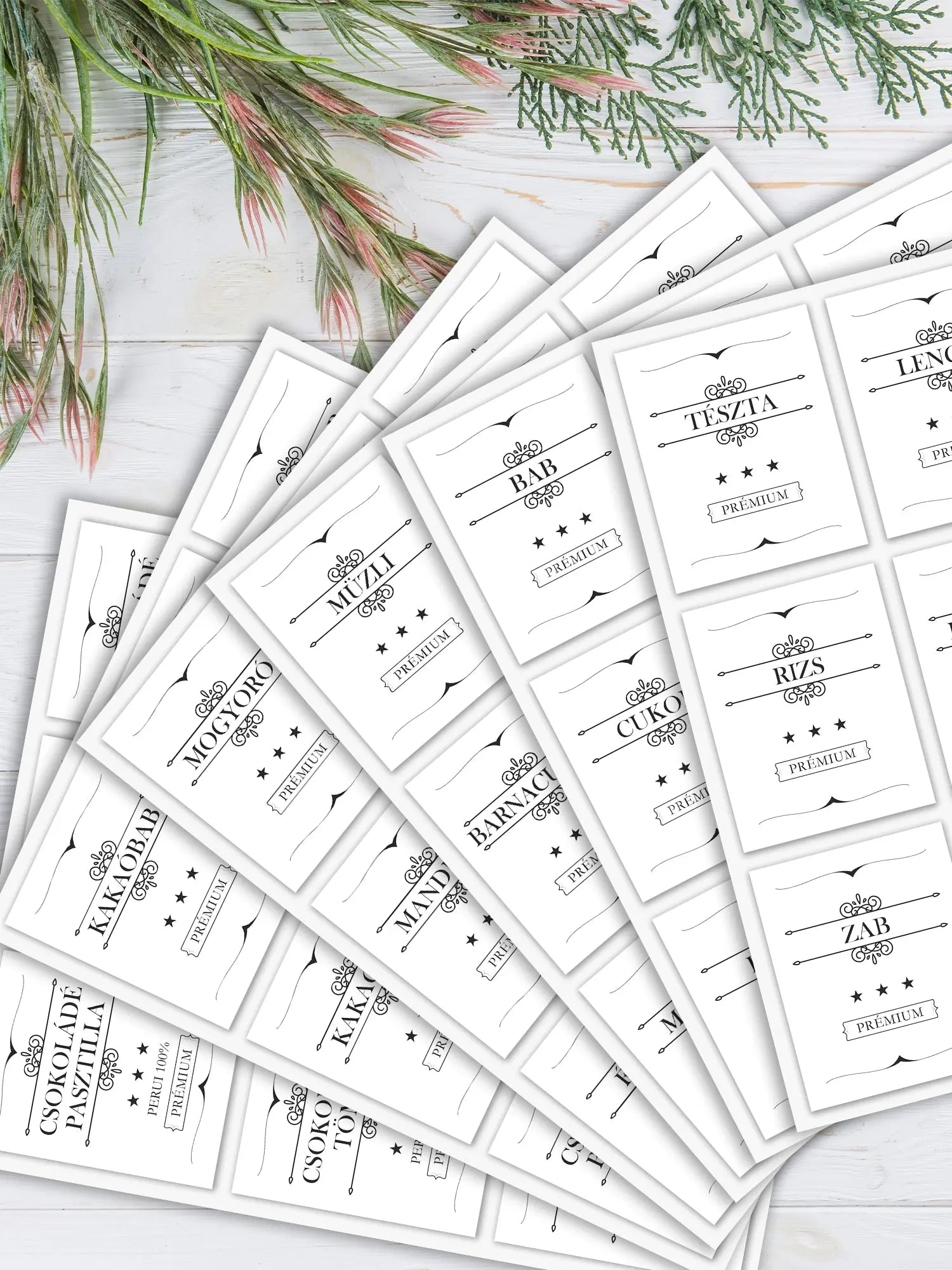 Élelmiszer matricák: Aszalt gyümölcs, Bab, Balzsam ecet, Barnacukor, Bulgur, Csicseriborsó Cukor, Dara, Dió, Ecet, Étolaj, Fehérje, Granola, Hajdina, Keksz, Kesudió, Kuszkusz, Kávé, Kókusz, Kókuszolaj, Köles, Lencse, Lenmag, Liszt, Mandula, Mazsola, Mogyoró, Morzsa, Méz, Müzli, Olivaolaj, Pisztácia, Quinoa, Rizs, Superfood, Szezámmag, Sárgaborsó, Só, Tea, Tészta, Vörös lencse, Zab
